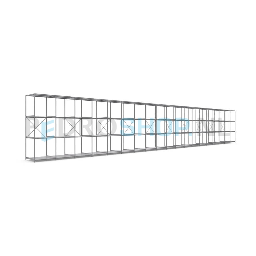 Metalen stellingkast: 300cm (h) x 100cm (d) x 1915cm (l)